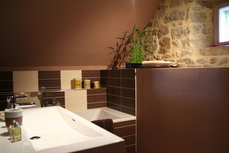 Suite familiale sous combles au deuxième étage composée d’une chambre avec 2 lits jumeaux de 90 x 190 cm + 1 lit d’appoint, salle d’eau avec douche à l’italienne, toilettes séparées, et d’une chambre avec grand lit de 160 x 200 cm, coin salon et salle de bain. Tons chauds, atmosphère teintée d’exotisme. Plateaux de courtoisie.