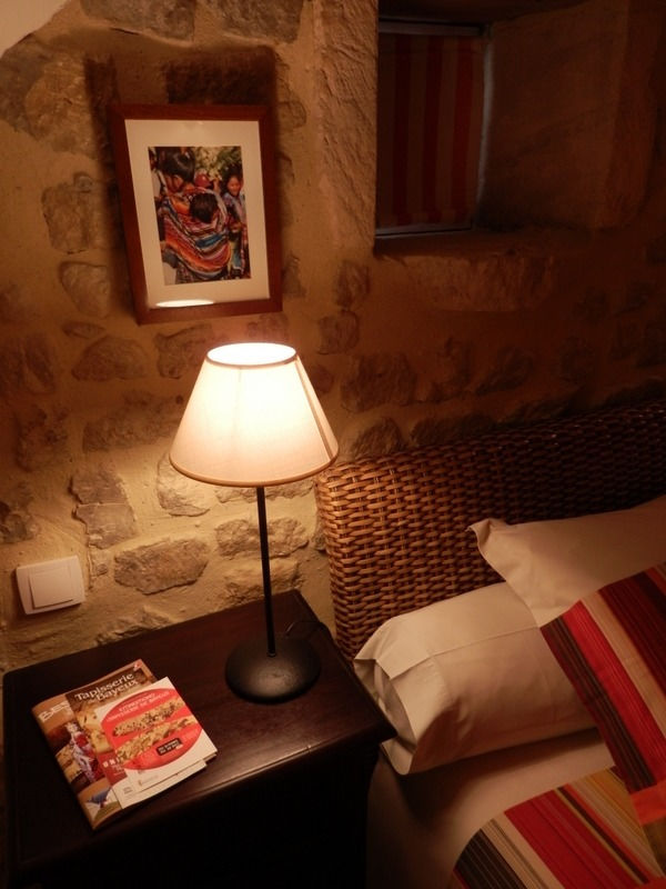 Très cocooning avec mur en pierres, poutres apparentes et tons chauds.