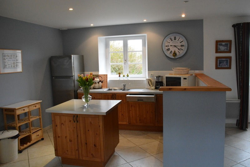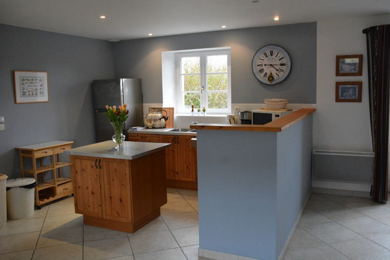 - grande pièce salle à manger (grande table 12 couverts si réunion des familles des deux gîtes) et cuisine américaine très bien équipée : réfrigérateur/congélateur, four électrique, four micro-ondes, plaque vitrocéramique, lave-vaisselle, lave-linge, petit matériel électrique …, tout équipement de vaisselle. Planche et fer à repasser, aspirateur, séchoir à linge.